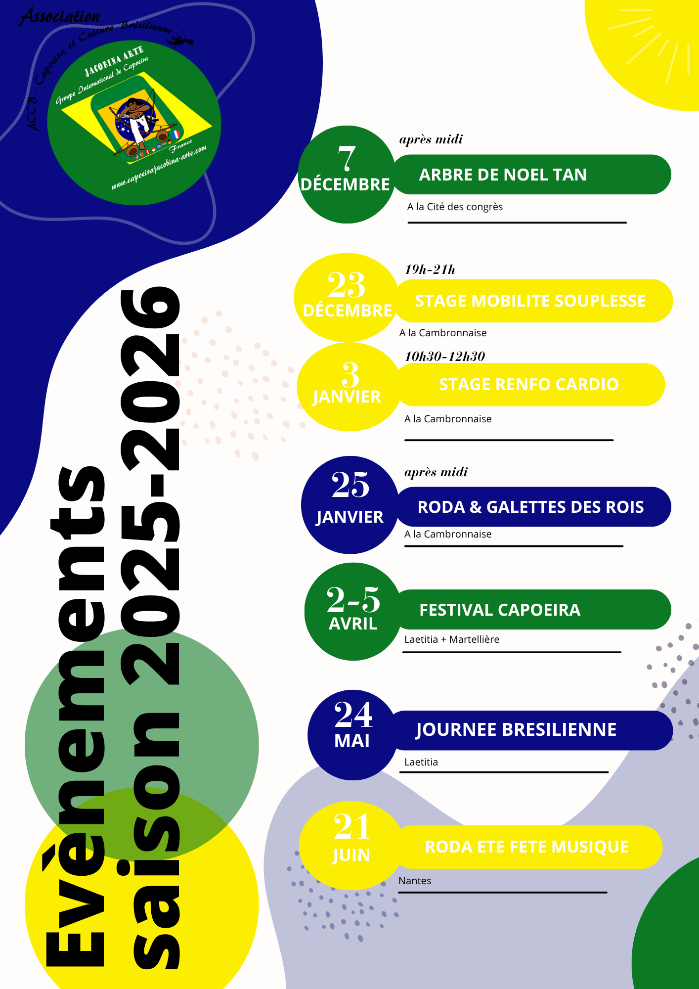 • Le festival de capoeira (batizado passage de corde) aura lieu le weekend de Pâques, le 4-5 avril 2026, au gymnase de la martellière, à St Sébastien sur Loire. On reviendra vers vous plus tard pour de plus amples informations mais notez dores et déjà la date dans vos agendas.